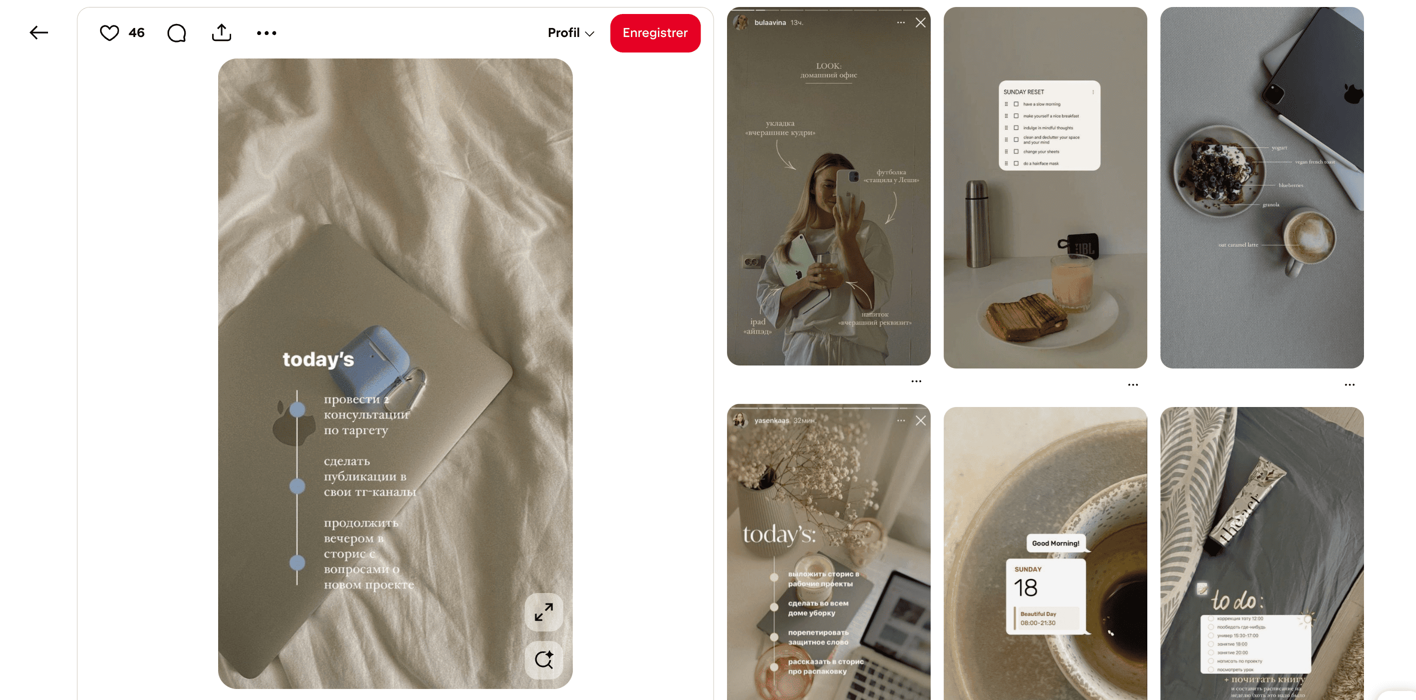 Vous pouvez également faire votre veille sur Pinterest en tapant “template story aesthetic” et naviguer entre les différentes épingles pour trouver l’inspiration.