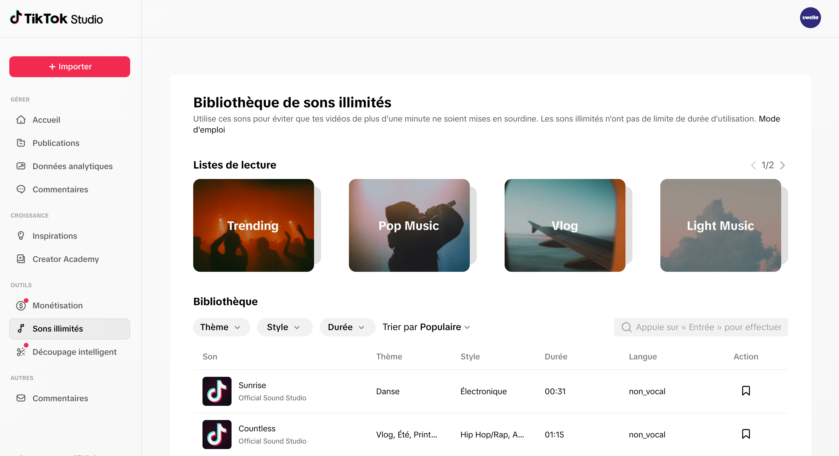 Au moment d’ajouter une vidéo, TikTok vous donne accès à une bibliothèque de sons très complète. Des milliers de morceaux sont à votre disposition et ils sont souvent triés par popularité !