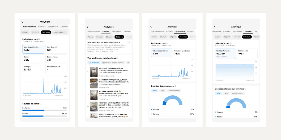 “Les données analytiques sur TikTok sont très faciles d’accès grâce au TikTok Studio, qui centralise toutes les statistiques essentielles. Cette interface permet d’obtenir une vision claire des performances globales et des caractéristiques de son audience. Par exemple, sur mon compte dédié à la maison et à la décoration, j’ai pu constater que 90 % de mon audience est composée de femmes. Ce type d’information est précieux pour ajuster son ton, ses thématiques ou encore ses visuels. J’aime également analyser le classement de mes publications les plus vues : cela m’aide à identifier les formats ou sujets qui plaisent le plus, à affiner ma stratégie de contenu et à trouver de nouvelles idées pour les prochaines vidéos.”
